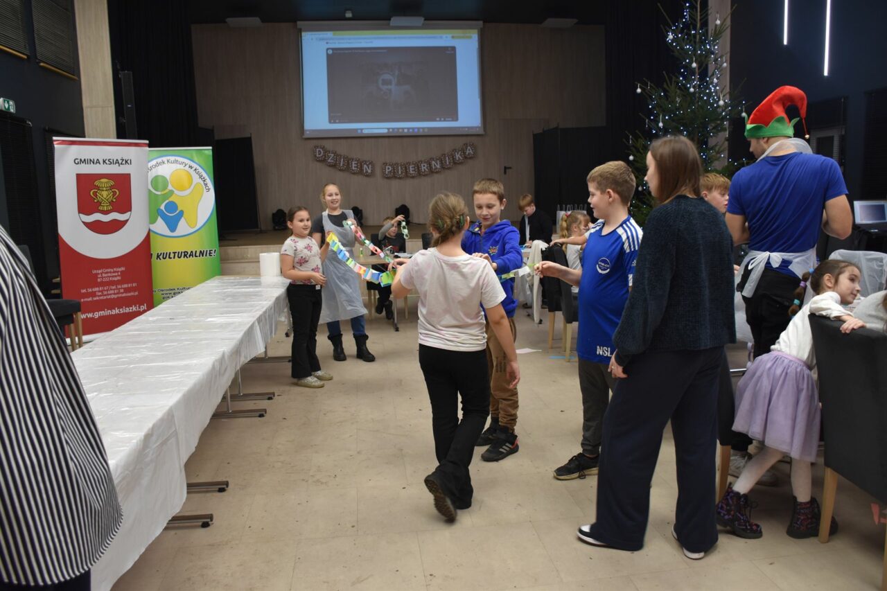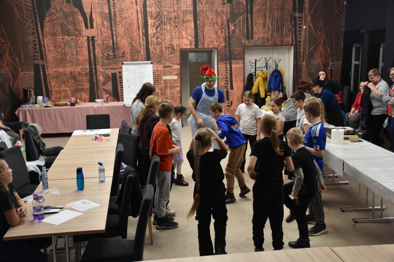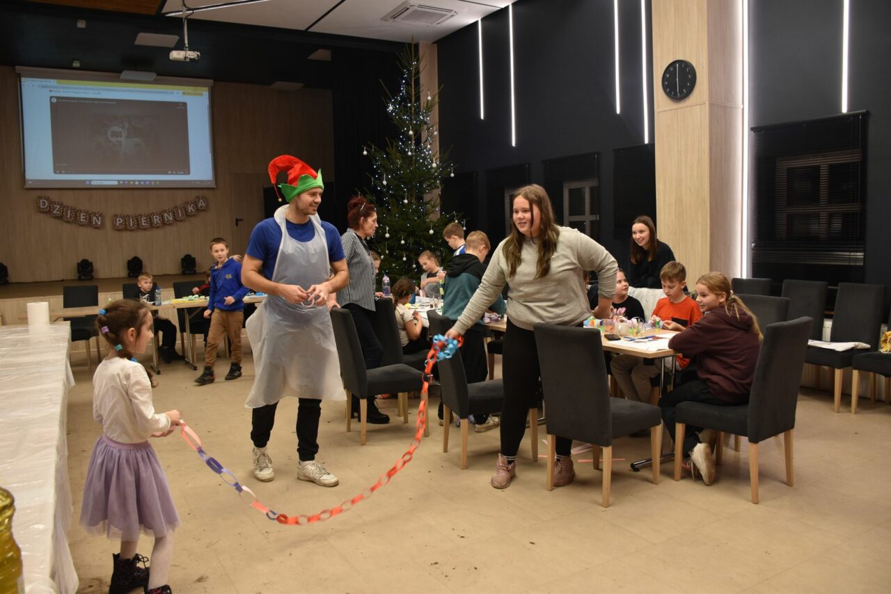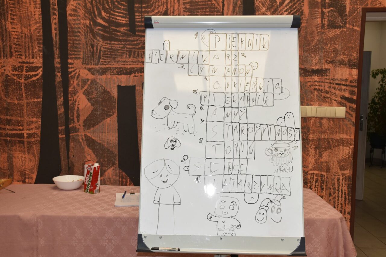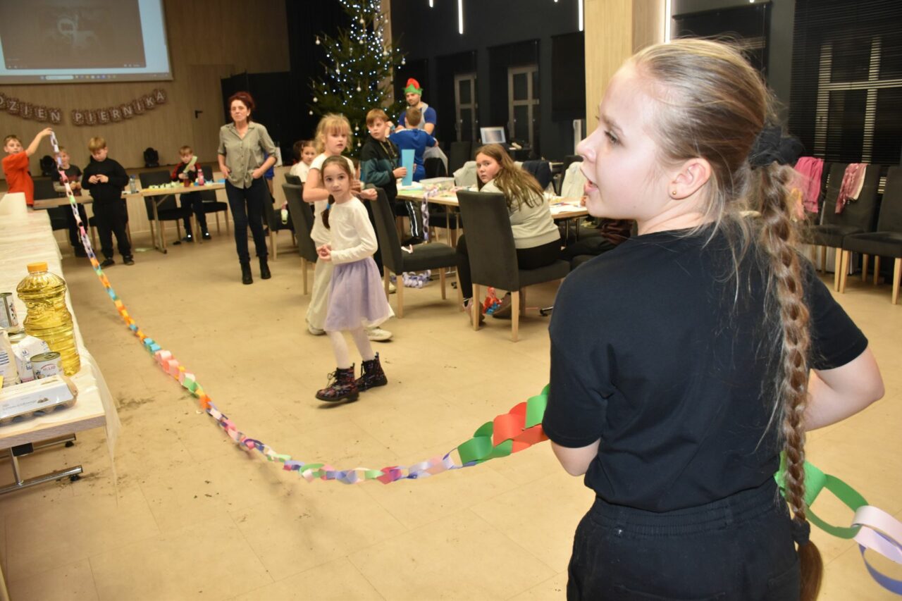 W czasie, gdy pierniki trafiały do piekarnika, dzieci nie próżnowały – czas umilał im Świąteczny Skrzat Natan, który zaprosił najmłodszych do wspólnych zabaw integracyjnych, m.in. rozwiązywania piernikowej krzyżówki i aktywności tematycznych związanych z tym wyjątkowym dniem.