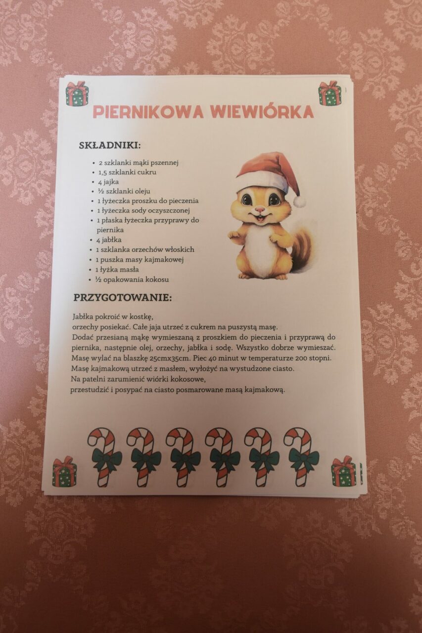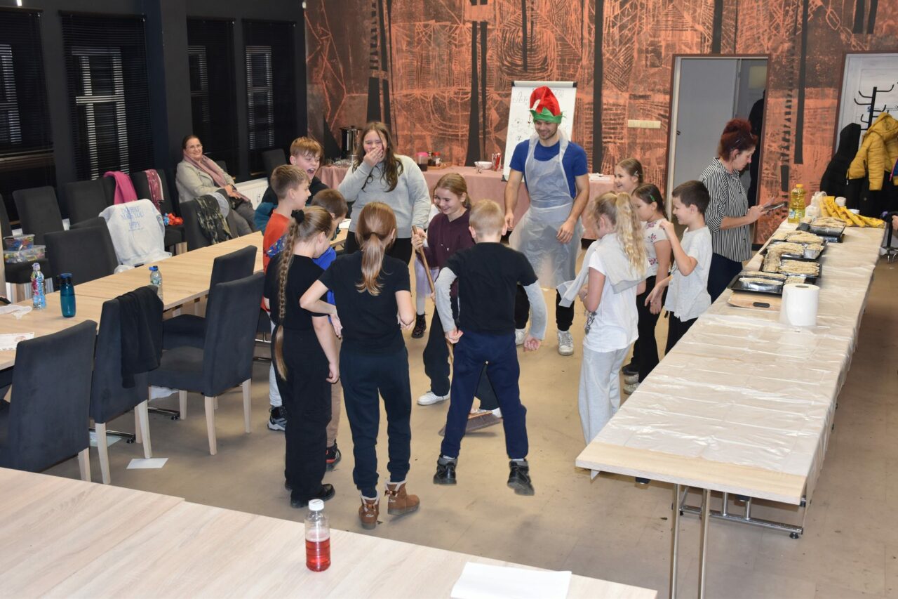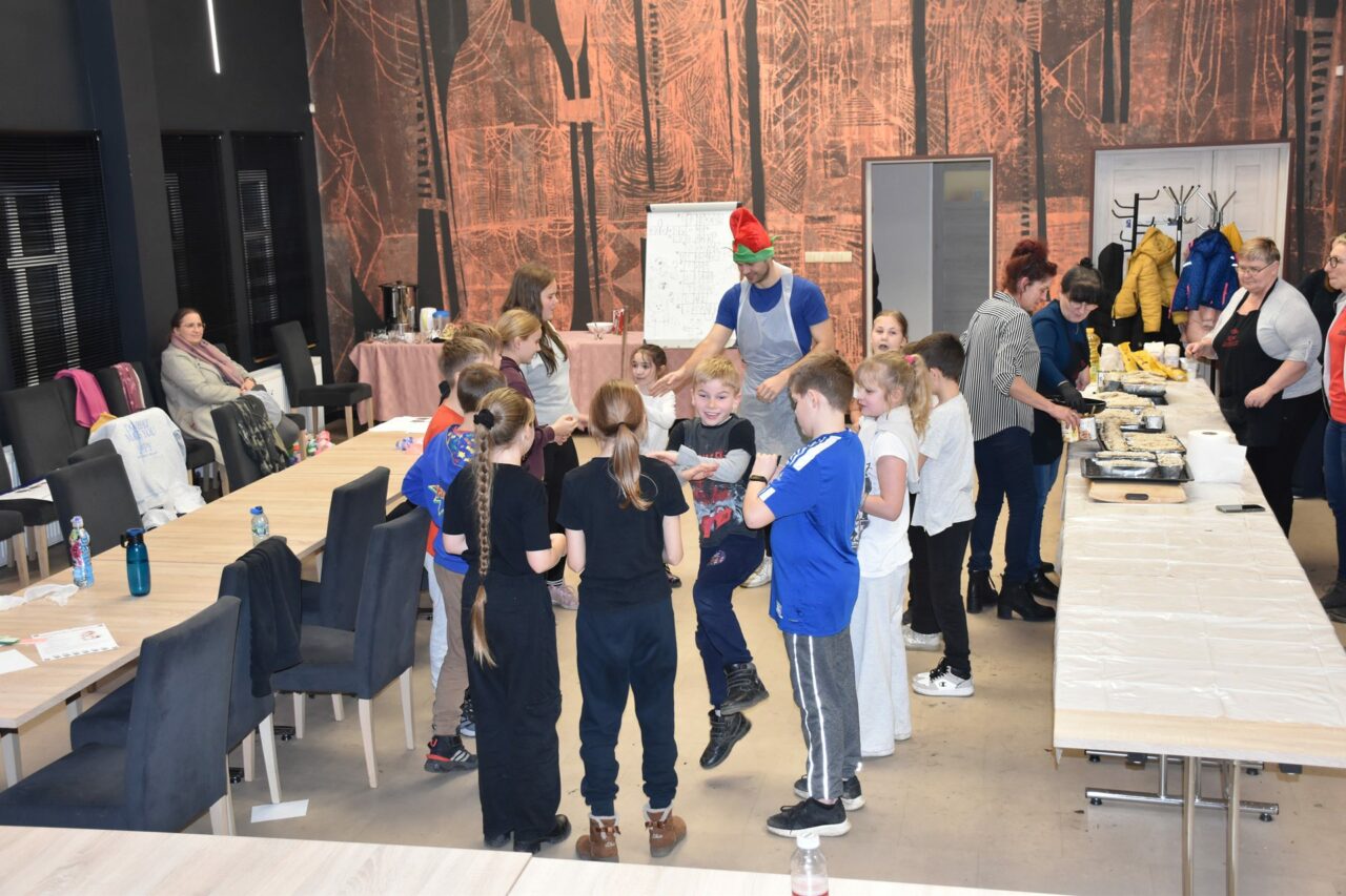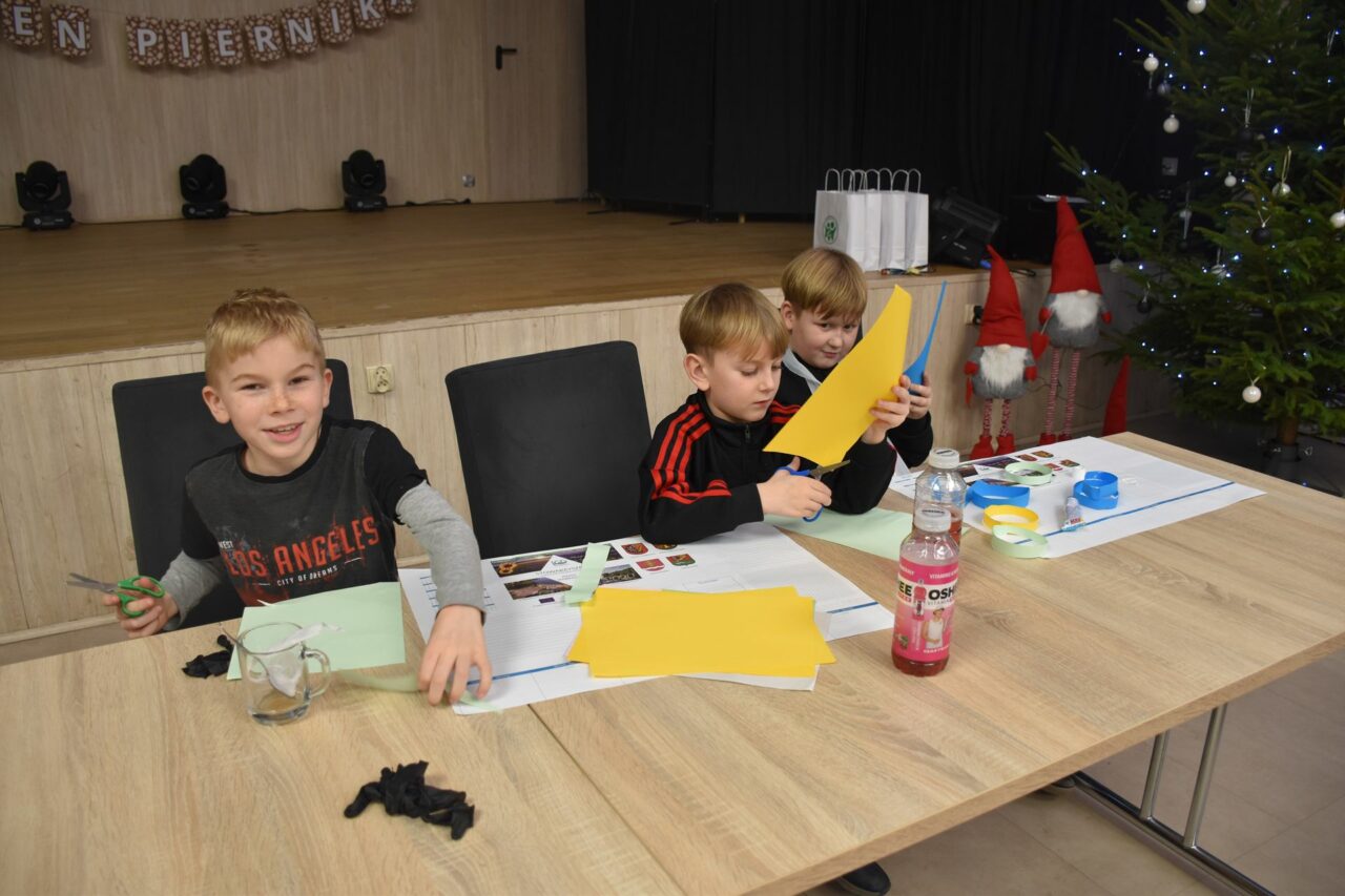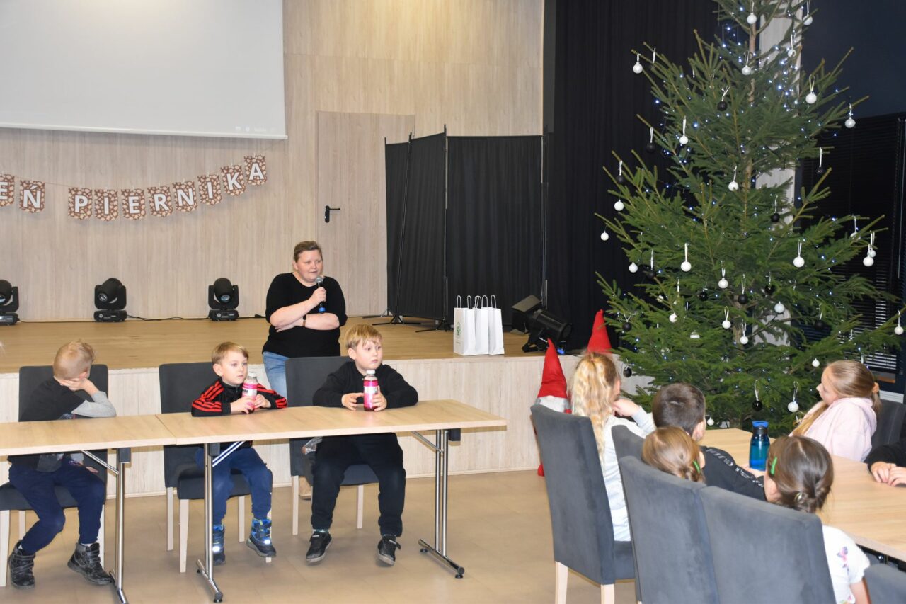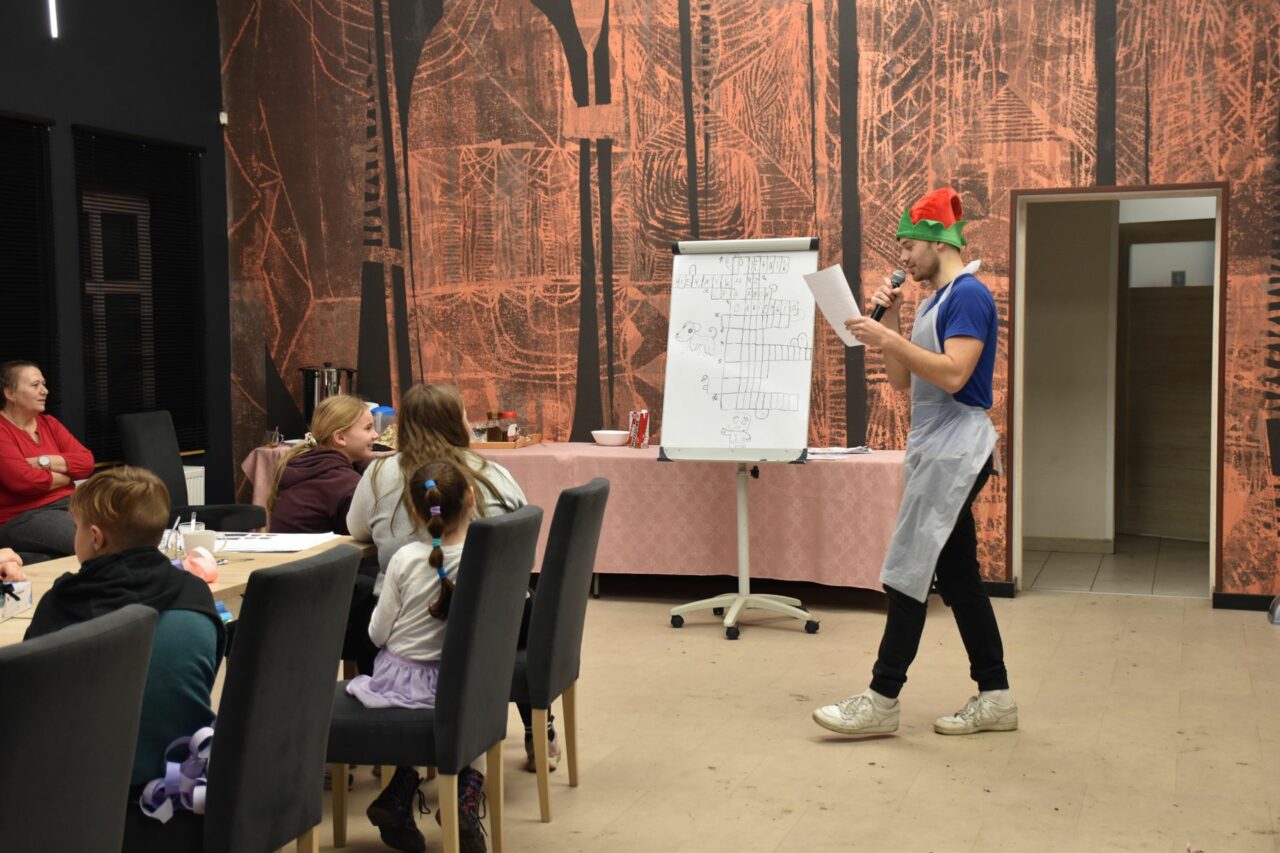 W czasie, gdy pierniki trafiały do piekarnika, dzieci nie próżnowały – czas umilał im Świąteczny Skrzat Natan, który zaprosił najmłodszych do wspólnych zabaw integracyjnych, m.in. rozwiązywania piernikowej krzyżówki i aktywności tematycznych związanych z tym wyjątkowym dniem.