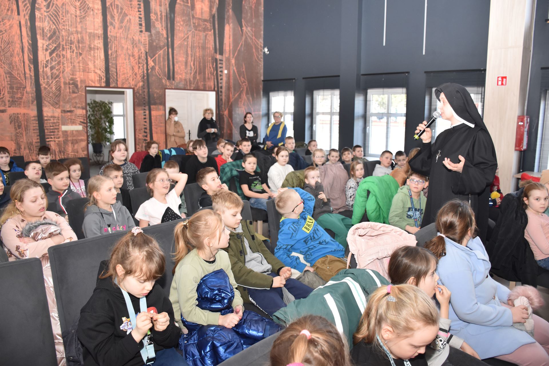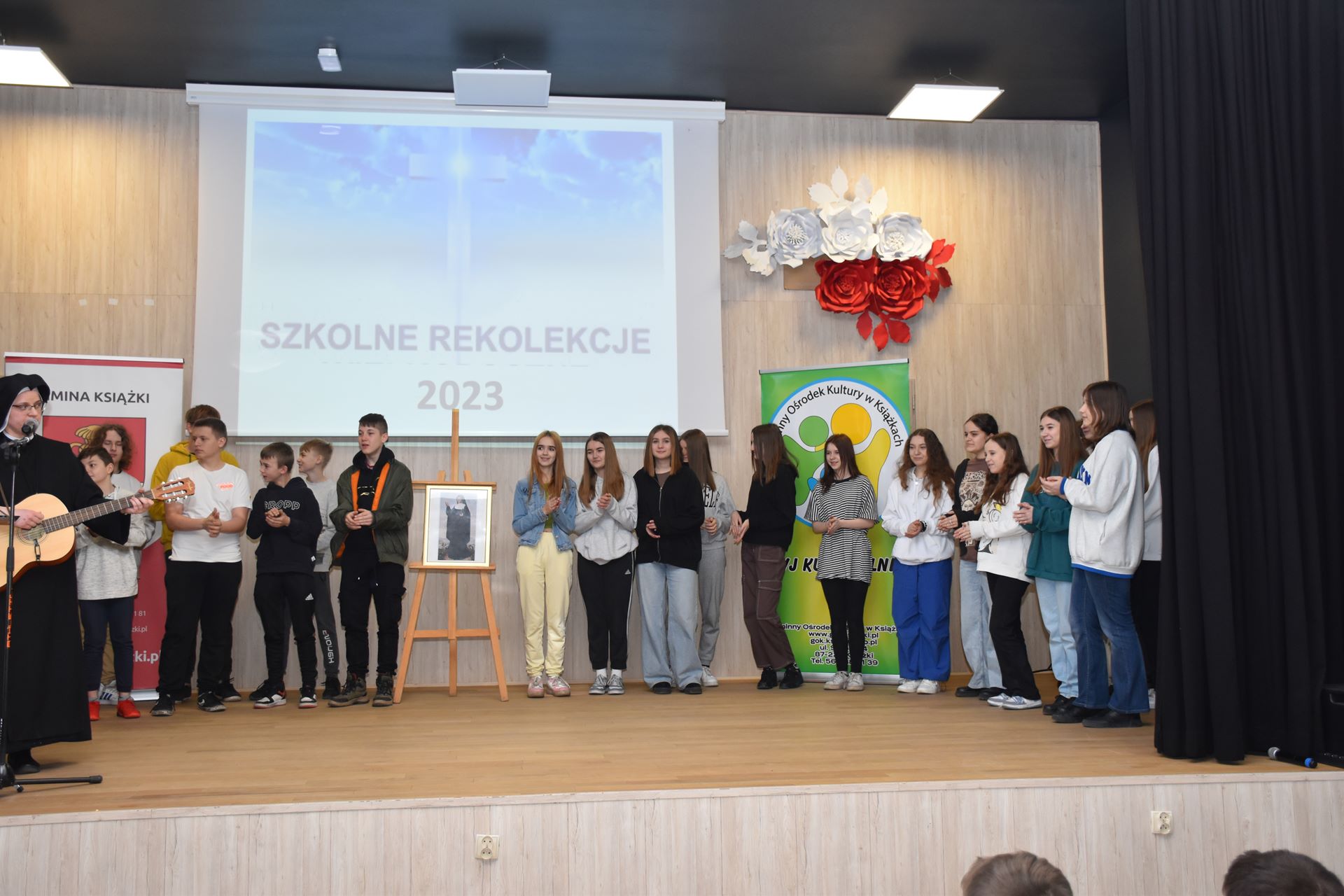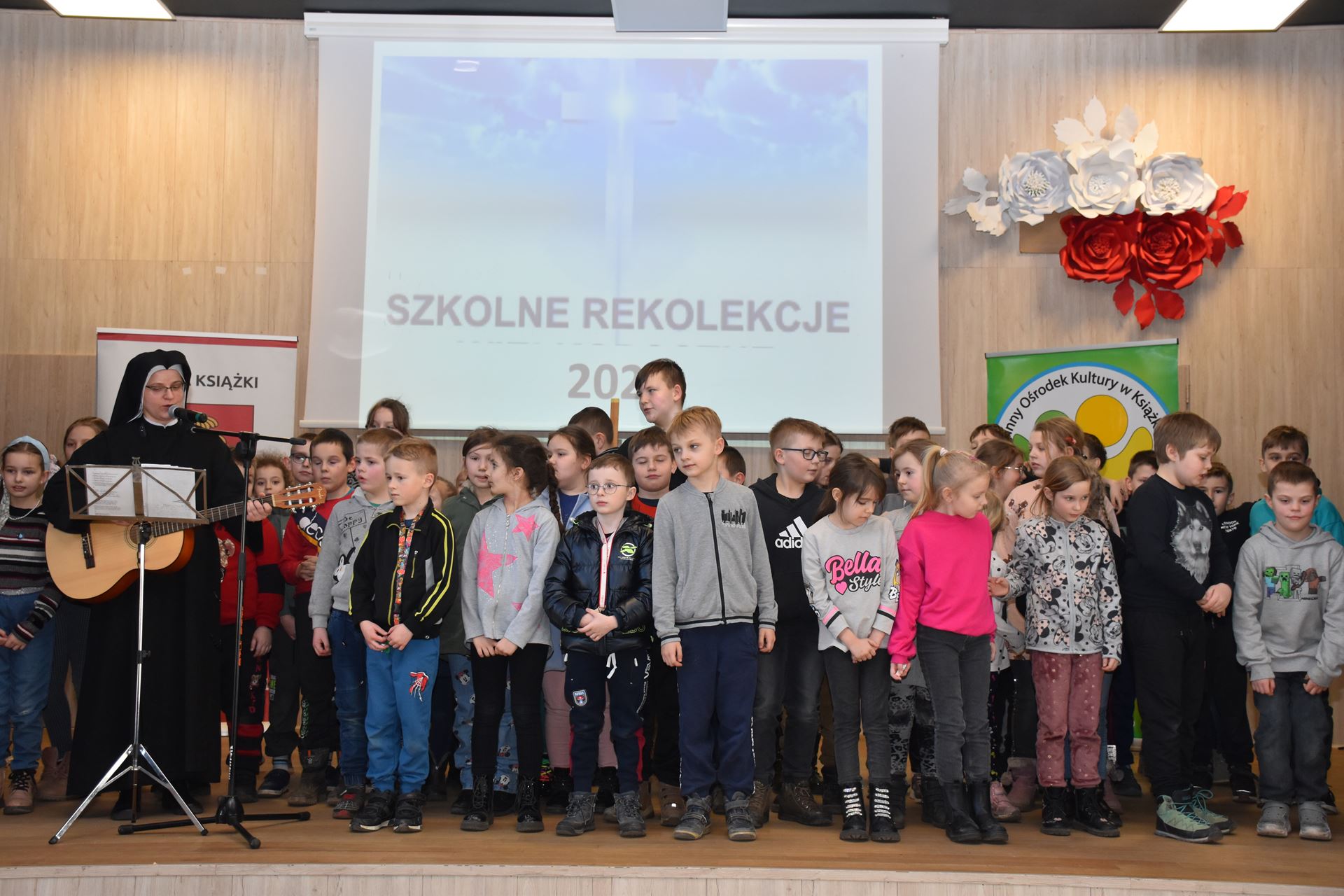W czwartek mieliśmy przyjemność gościć na naszej sali uczniów Szkoły Podstawowej i Przedszkola w Książkach wraz z księdzem proboszczem parafii Książki Zbigniewem Żyndą oraz zaproszonymi gośćmi. Sala GOK stała się centrum „żywej” katechezy prowadzonej w ramach rekolekcji szkolnych.