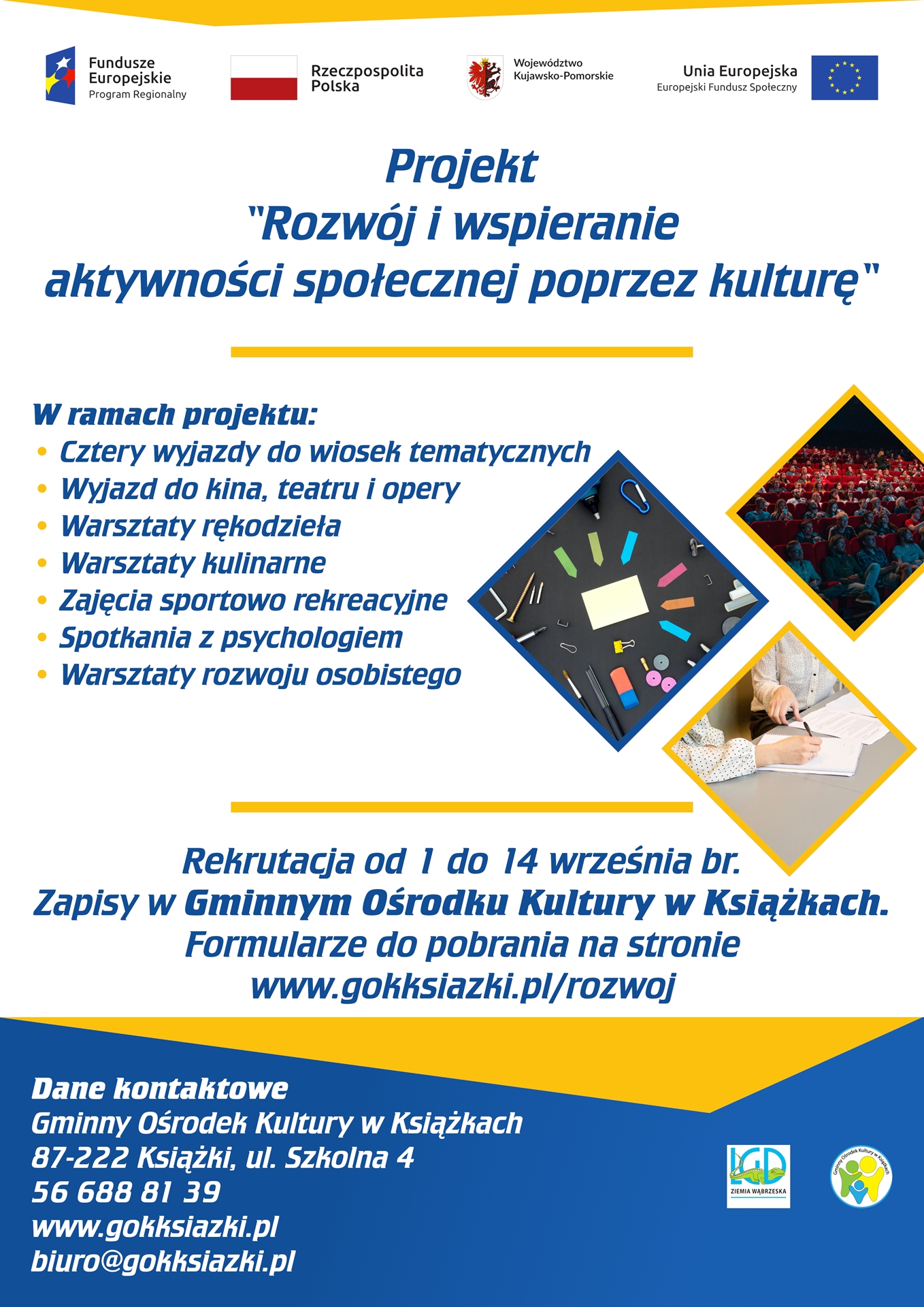 Zapraszamy do udziału w projekcie „Rozwój i wspieranie aktywności społecznej poprzez kulturę”. Szczegóły na plakacie oraz w siedzibie GOK.