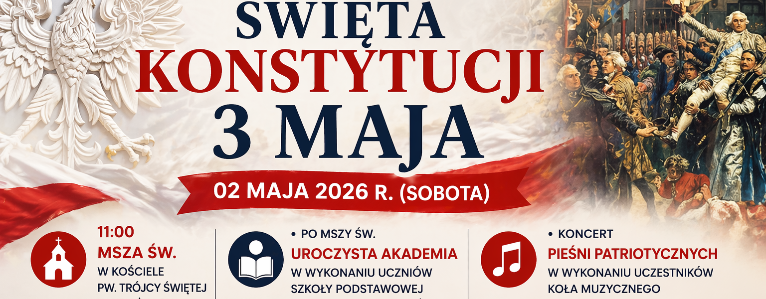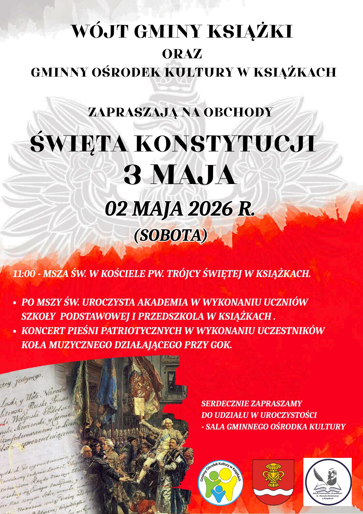 Wójt Gminy Książki oraz Gminny Ośrodek Kultury w Książkach zapraszają do udziału w obchodach Święta Konstytucji 3 Maja, które odbędą się 2 maja 2026 roku (sobota).