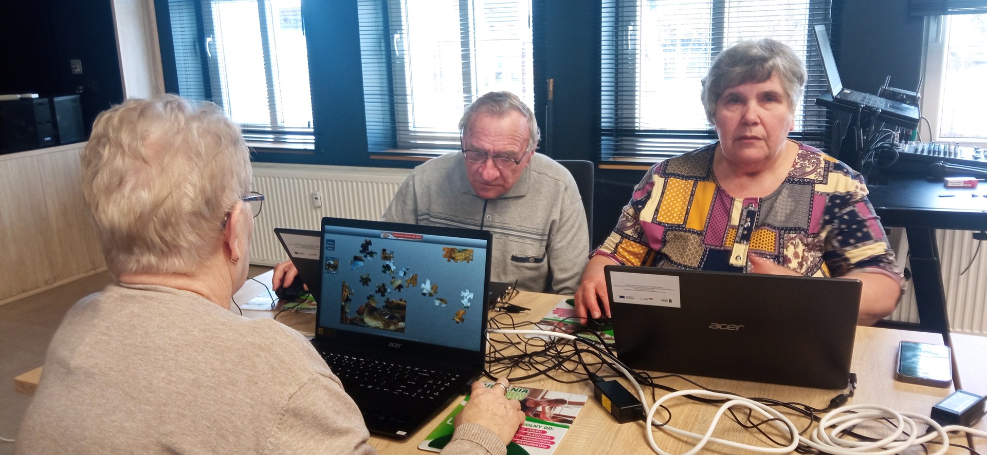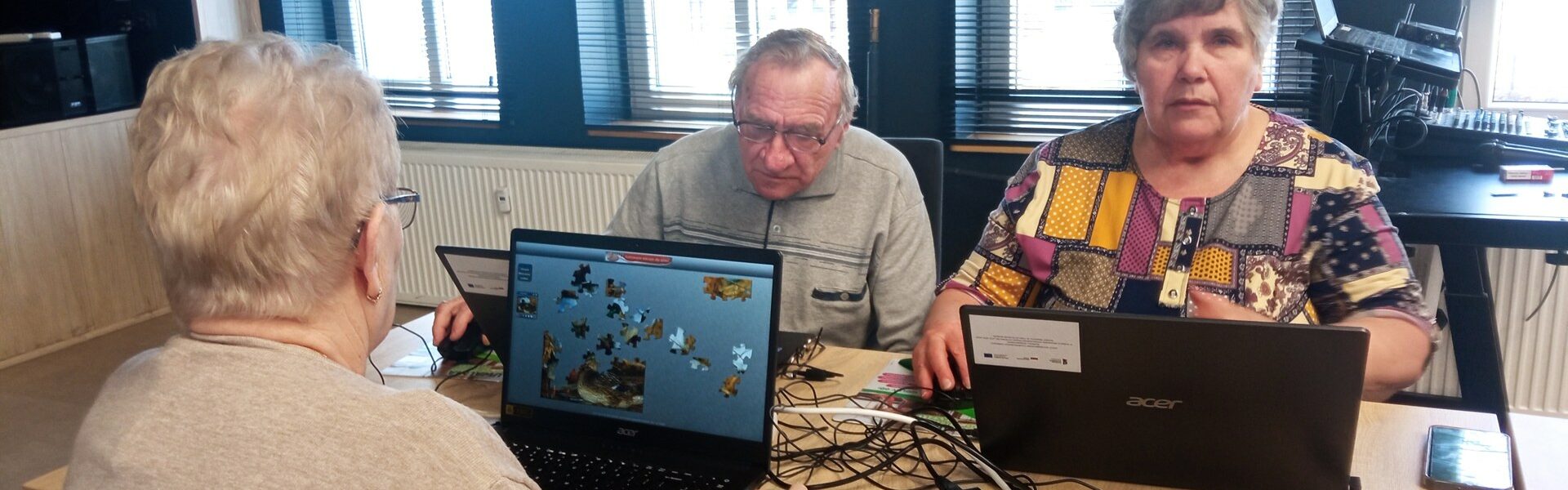 Nie zabrakło również chwili na naukę poprzez zabawę 🙂 Uczestnicy chętnie próbowali swoich sił w prostych grach komputerowych – układali puzzle oraz tzw. „diamenciki”, rozwijając przy tym spostrzegawczość i refleks.
