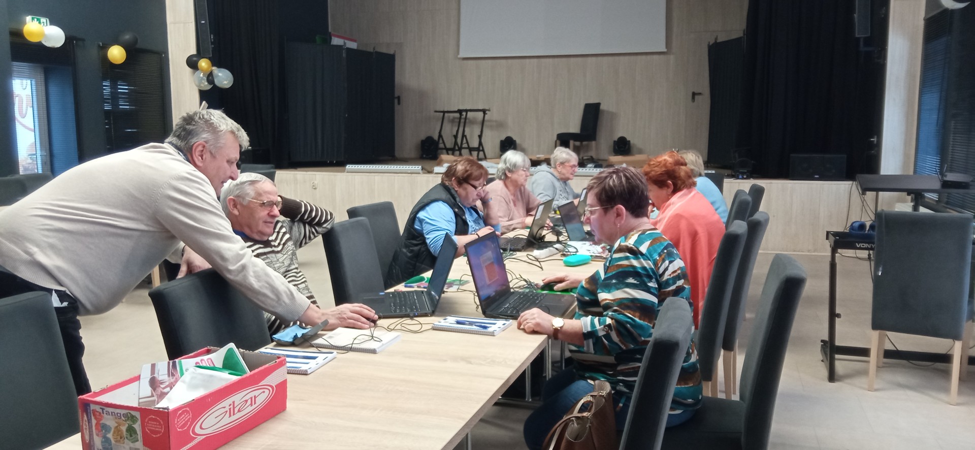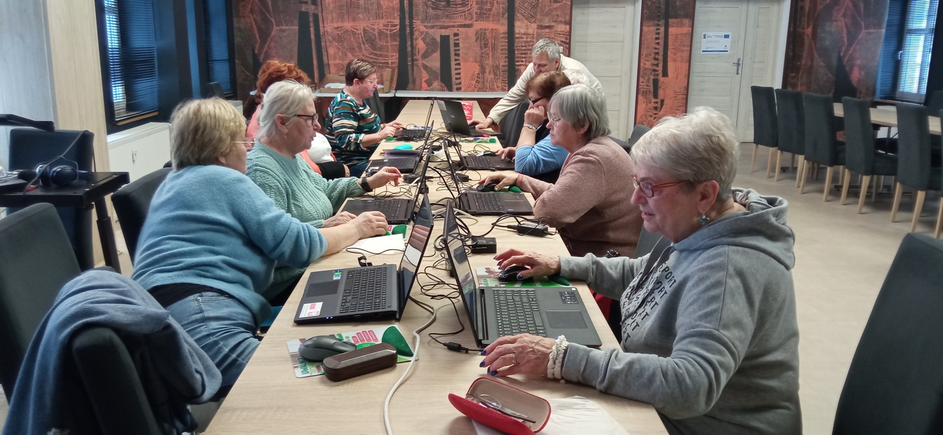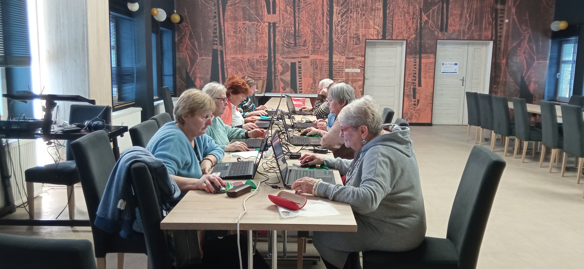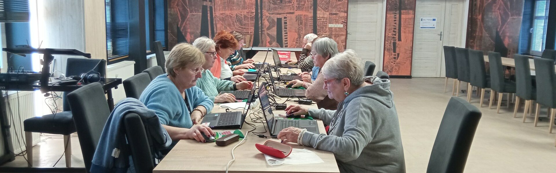 Zajęcia przebiegały w spokojnej, kameralnej atmosferze, sprzyjającej zadawaniu pytań i wspólnej nauce. Uczestnicy pracowali na laptopach, ćwicząc nowe umiejętności w praktyce i wzajemnie dzieląc się swoimi doświadczeniami.