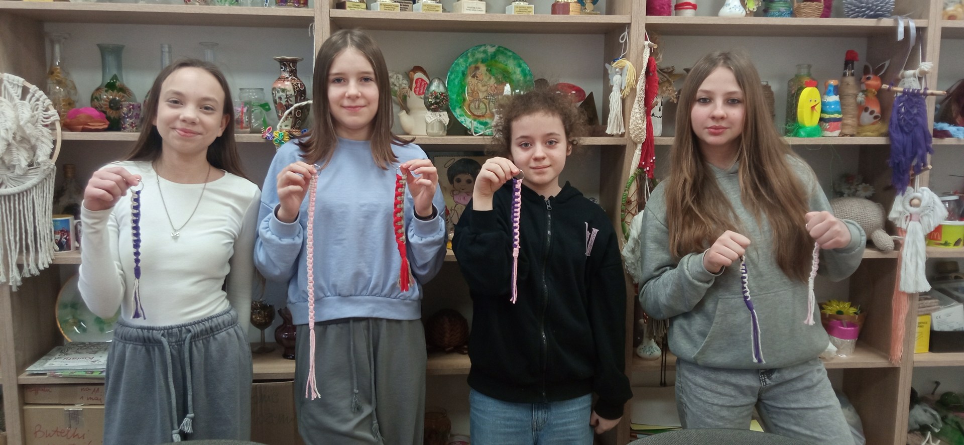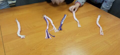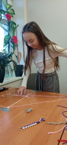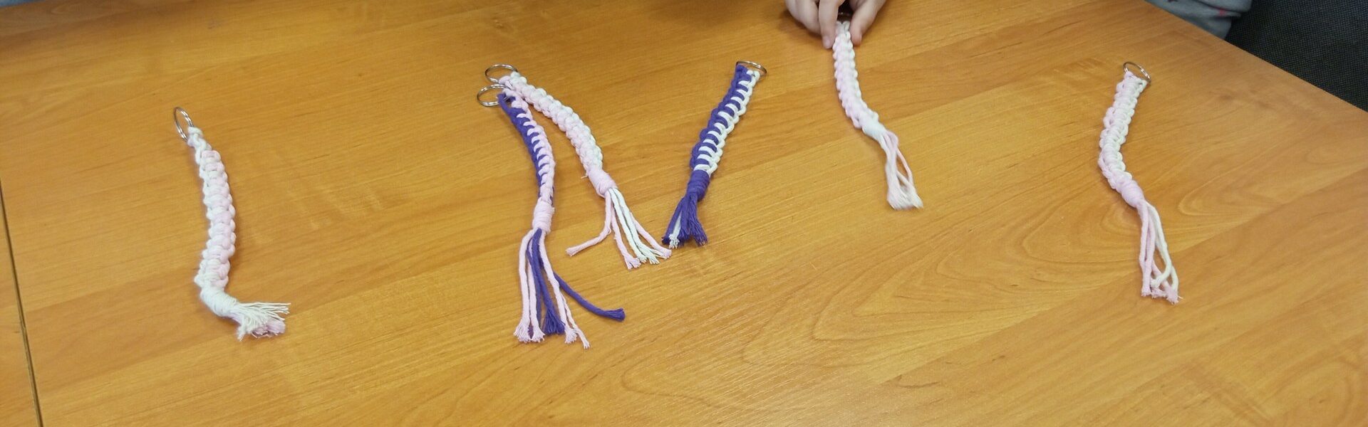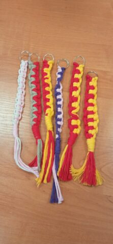 Uczestnicy wykonywali breloki metodą makramy, wykorzystując splot frywolitkowy.